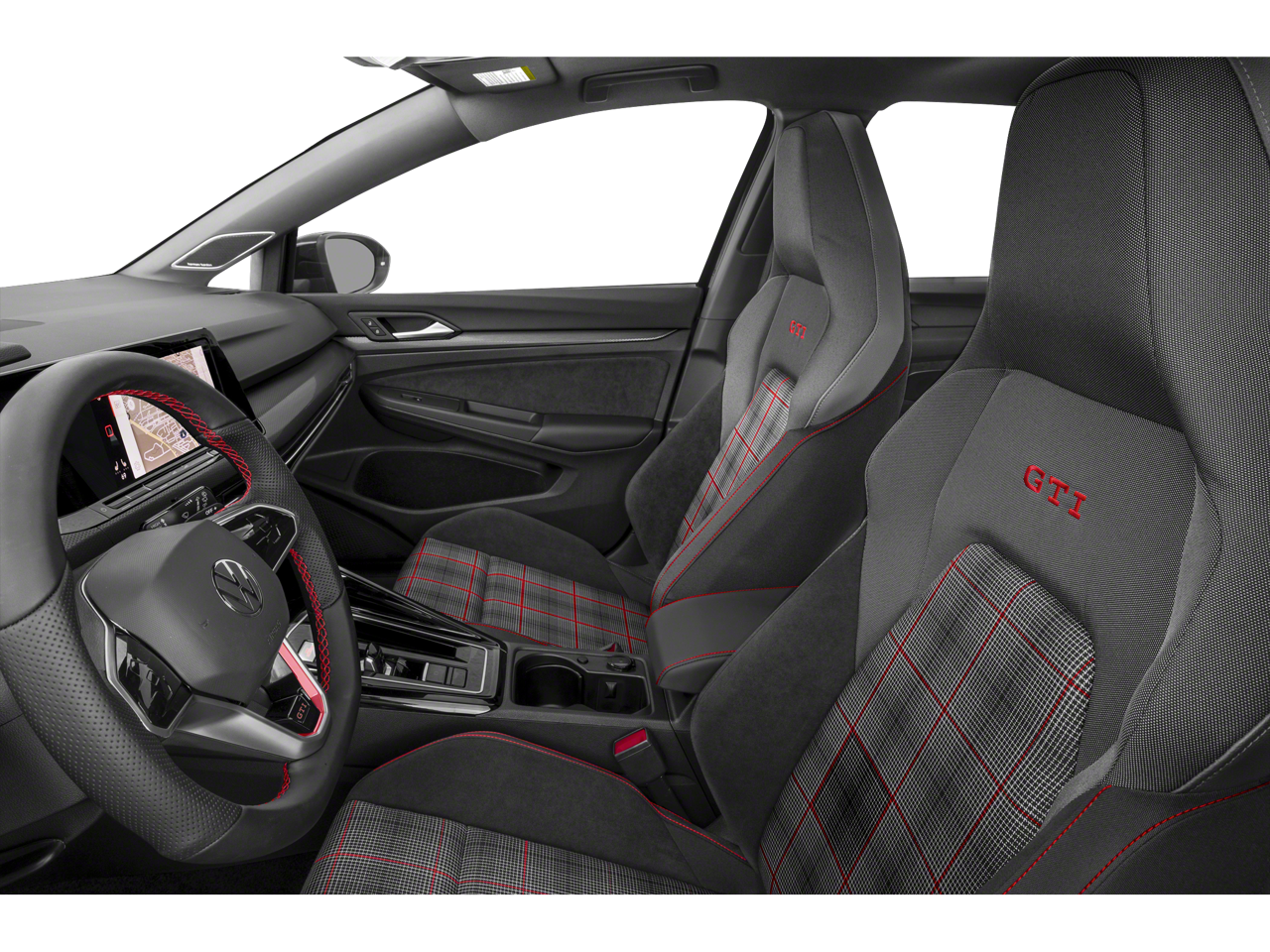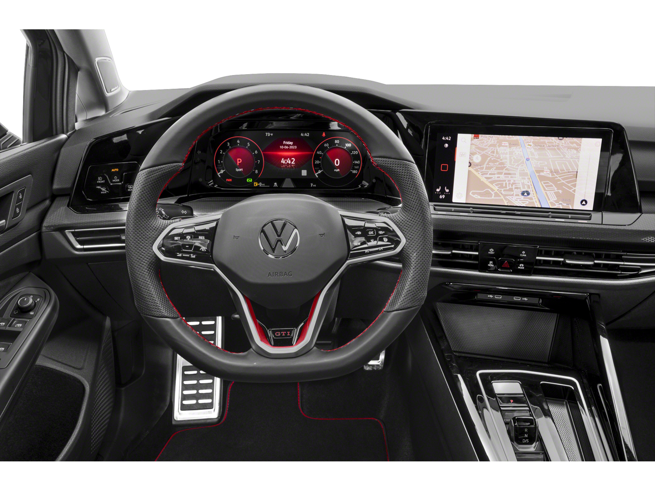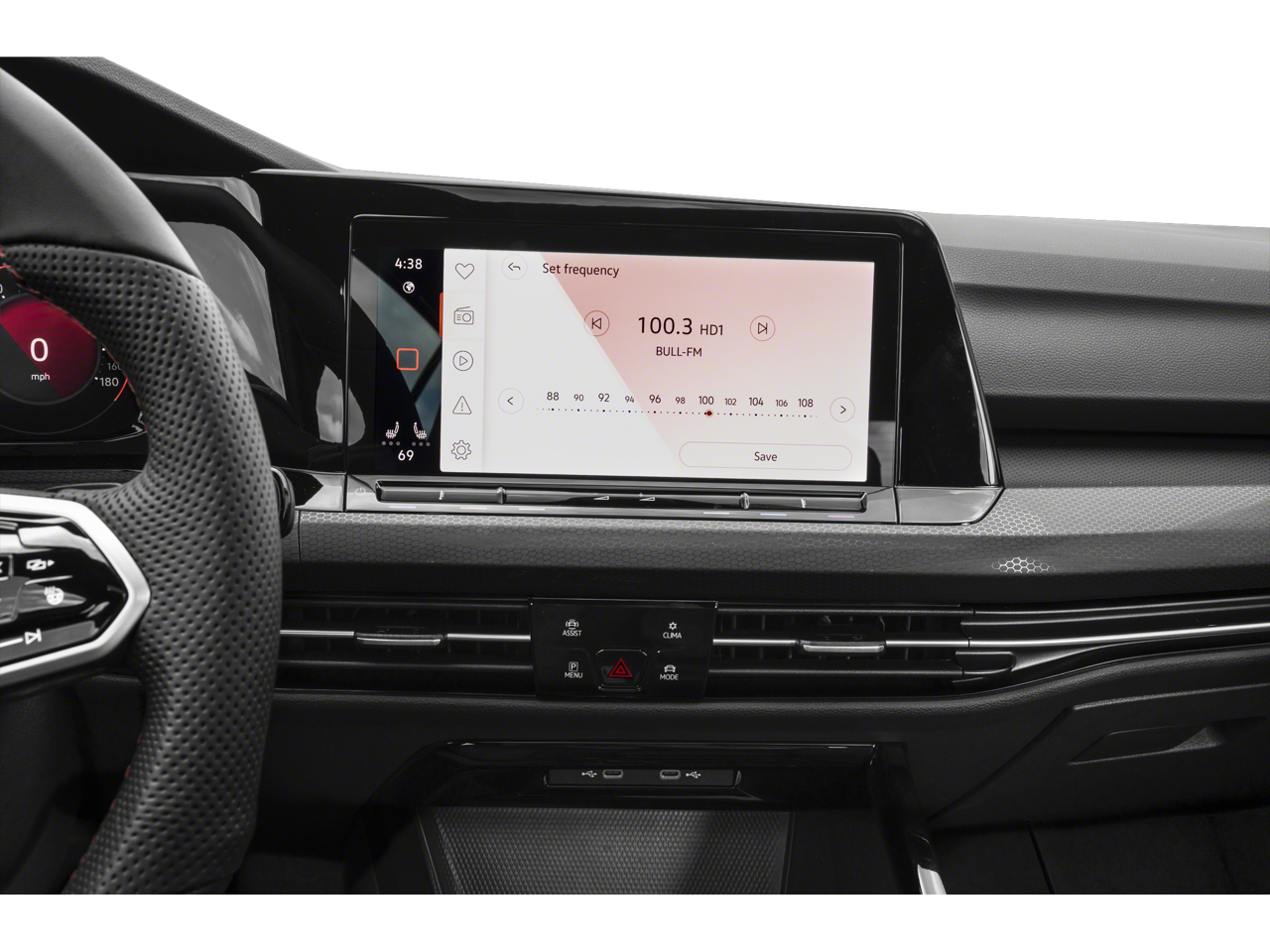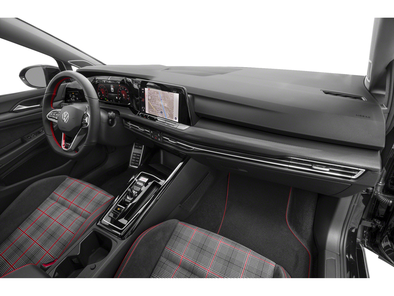 This 2024 Black Volkswagen Golf GTI SE FWD is well equipped and includes these features and benefits: 4-Wheel Disc Brakes, 9 Speakers, ABS brakes, Adaptive suspension, Air Conditioning, Alloy wheels, AM/FM radio: SiriusXM with 360L, Auto-dimming Rear-View mirror, Automatic temperature control, Brake assist, Bumpers: body-color, Cloth Seating Surfaces, Compass, Delay-off headlights, Driver door bin, Driver vanity mirror, Dual front impact airbags, Dual front side impact airbags, Electronic Stability Control, Emergency communication system: VW Car-Net Safe & Secure 5-year, Exterior Parking Camera Rear, Forward collision: FCW w/Autonomous Emergency Braking mitigation, Four wheel independent suspension, Front anti-roll bar, Front Bucket Seats, Front Center Armrest, Front fog lights, Front reading lights, Fully automatic headlights, harman/kardon® Speakers, Heated door mirrors, Heated front seats, Heated Front Top Sport Seats, Heated steering wheel, Illuminated entry, Lane Departure Warning System, Leather Shift Knob, Leather steering wheel, Low tire pressure warning, Navigation System, Occupant sensing airbag, Outside temperature display, Overhead airbag, Overhead console, Panic alarm, Passenger door bin, Passenger vanity mirror, Power door mirrors, Power driver seat, Power moonroof: Panoramic, Power passenger seat, Power steering, Power windows, Radio data system, Radio: MIB3 Discover Pro w/10 Touchscreen Navi, Rain sensing wipers, Rear anti-roll bar, Rear reading lights, Rear seat center armrest, Rear window defroster, Rear window wiper, Remote keyless entry, Security system, Speed control, Speed-sensing steering, Speed-Sensitive Wipers, Split folding rear seat, Spoiler, Sport steering wheel, Steering wheel mounted audio controls, Tachometer, Telescoping steering wheel, Tilt steering wheel, Traction control, Trip computer, Turn signal indicator mirrors, Variably intermittent wipers, and Wheels: 19 Multi-Spoke Gloss Black Painted Alloy.